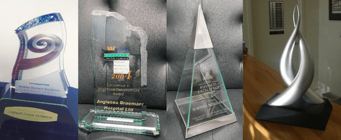 In 1999 the trophies for the Waikato Business Excellence Awards, as they were known back then, were produced by Emblems NZ. The design was a bespoke one with granite and acrylic, highlighted with gold and paua. The inaugural winners were Chibnall Swann Architects. Due to the cost of producing this award, it was only produced a couple of times.